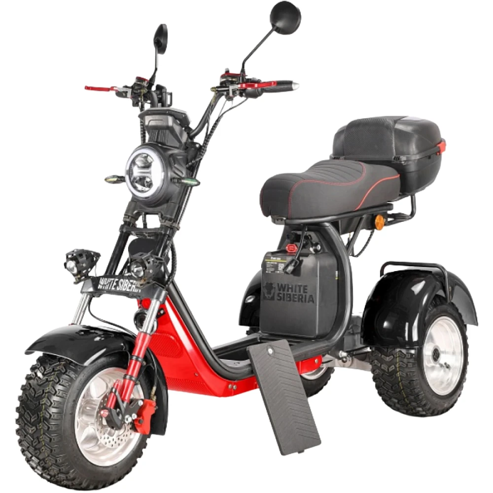 Трехколесный вариант электроскутера оснащен большими устойчивыми колесами, широким мягким сиденьем и вместительной кофрой. Техника оснащена всем необходимым для активного время провождения, поездки на рыбалку или другой вид отдыха.