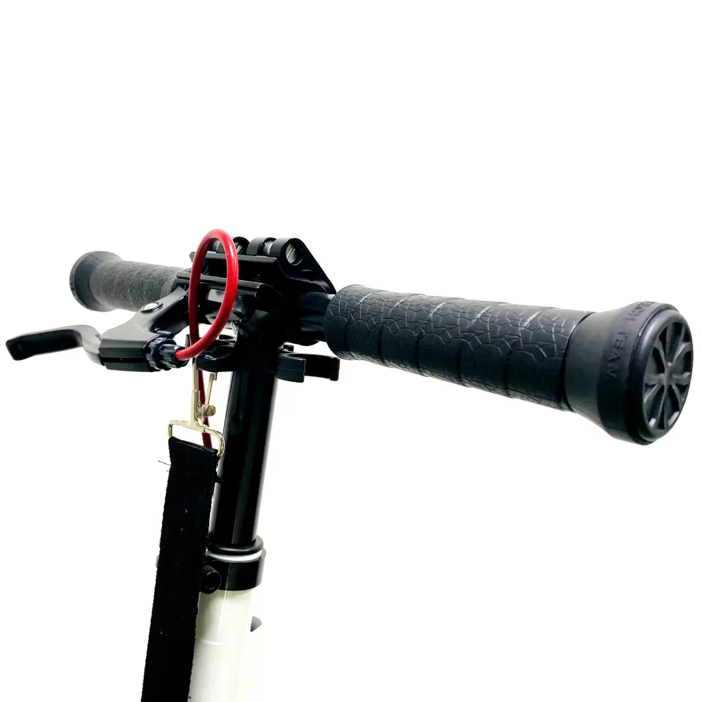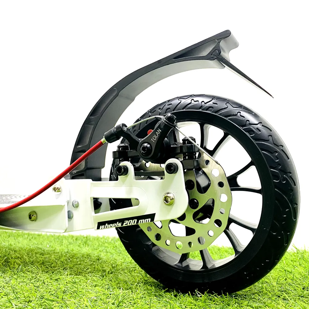 Самокат оснащен ручной дисковой тормозной системой. Украшенная по последнему писку моды техника привлекает внимание эстетически и технически.