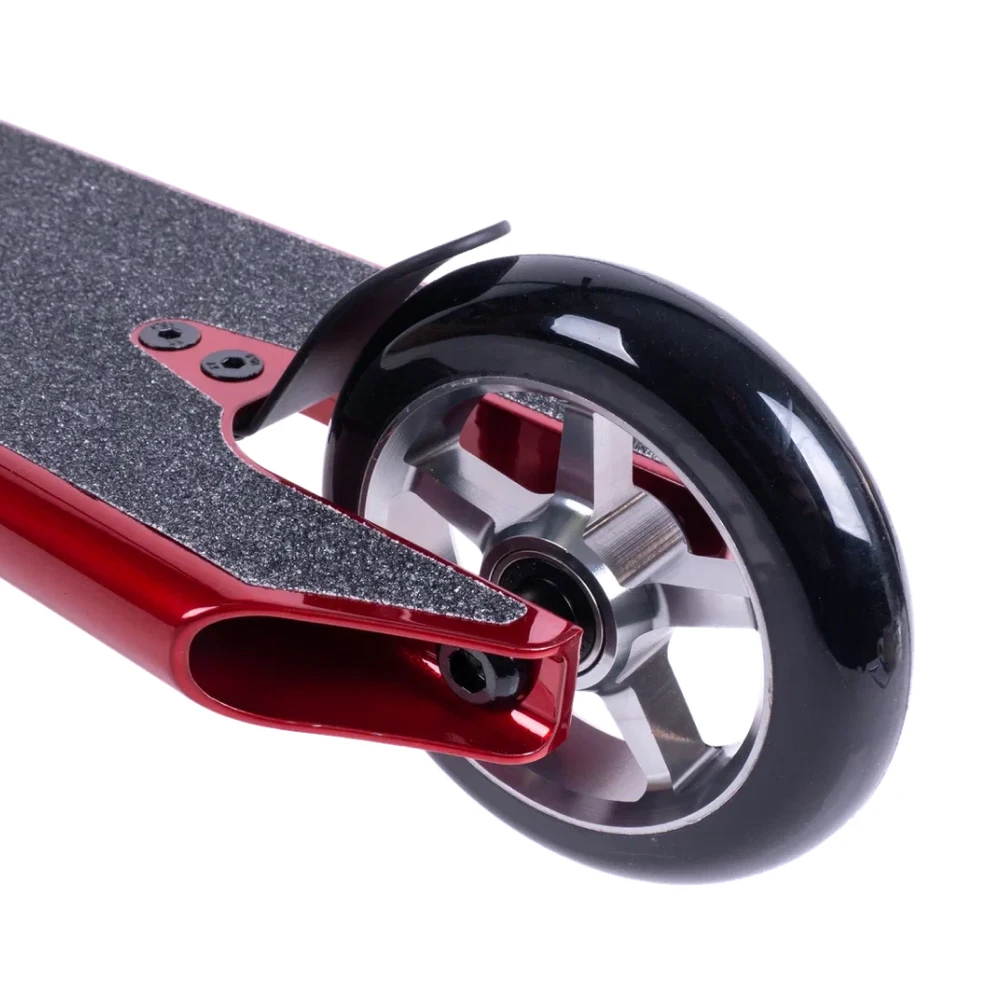 Дека самоката изготовлена из прочного алюминия ALU 6061, что обеспечивает надежность и долговечность конструкции. Красный цвет придает самокату стильный и энергичный вид. Колеса изготовлены из полиуретана, обеспечивая отличную амортизацию и плавную езду.